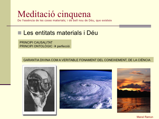 Però, ara que començo a conèixer-me millor a mi mateix i a descobrir més clarament l’autor del meu origen, no penso de veritat que hagi d’admetre temeràriament totes les coses que els sentits semblen ensenyar-nos, sinó que tampoc no penso pas que les hagi de revocar totes en general en el dubte.